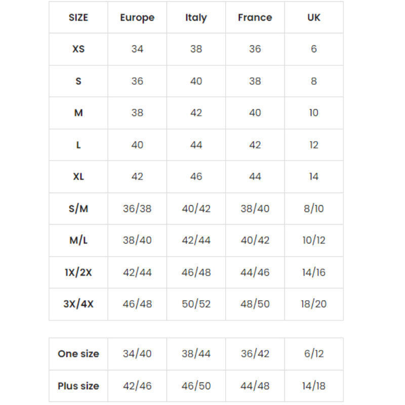 This is an approximate conversion table to help you find your size. If you have already purchased an item by our brand, we recommend you select the same size as indicated on its label.