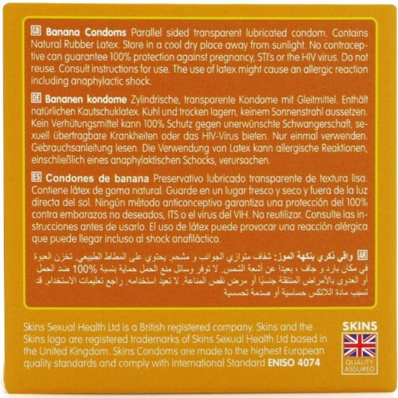 Verwen je smaakpapillen met de smaaksensatie van Skins Banana Condooms! 4 condooms met bananensmaak, individueel verpakt voor eenvoudig gebruik. Zie er goed uit! Voel je goed! Geniet van natuurlijk betere seks met een condoom dat aanvoelt als een deel van jezelf. Zo transparant en dun dat het aanvoelt als een tweede huid. Met Skins condooms kun je veilig genieten zonder in te leveren op plezier!