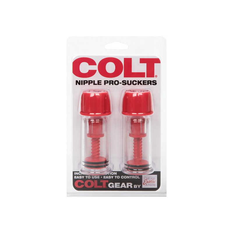 De Colt Nipple Prosuckers-set wordt geleverd in een strakke, moderne verpakking en maakt deel uit van de Colt Gear-collectie van CalExotics, een kwaliteitsmerk.