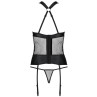 Het Amanda-korset is een innovatieve combinatie van leer achter een sensueel gaas, dat niet alleen de meest vrouwelijke vormen op verleidelijke wijze onthult, maar deze ook benadrukt. De gouden, wielvormige gewrichten geven het geheel karakter.